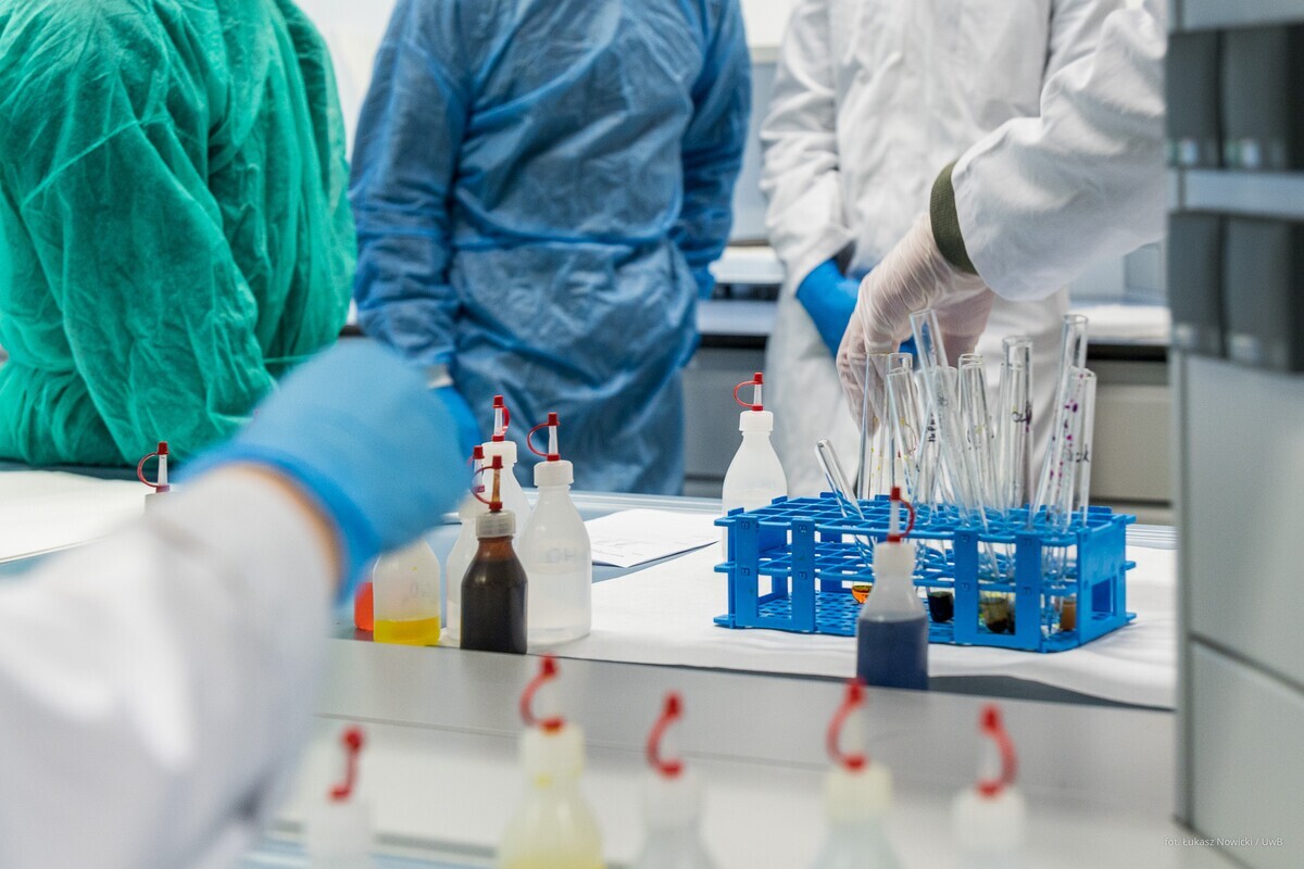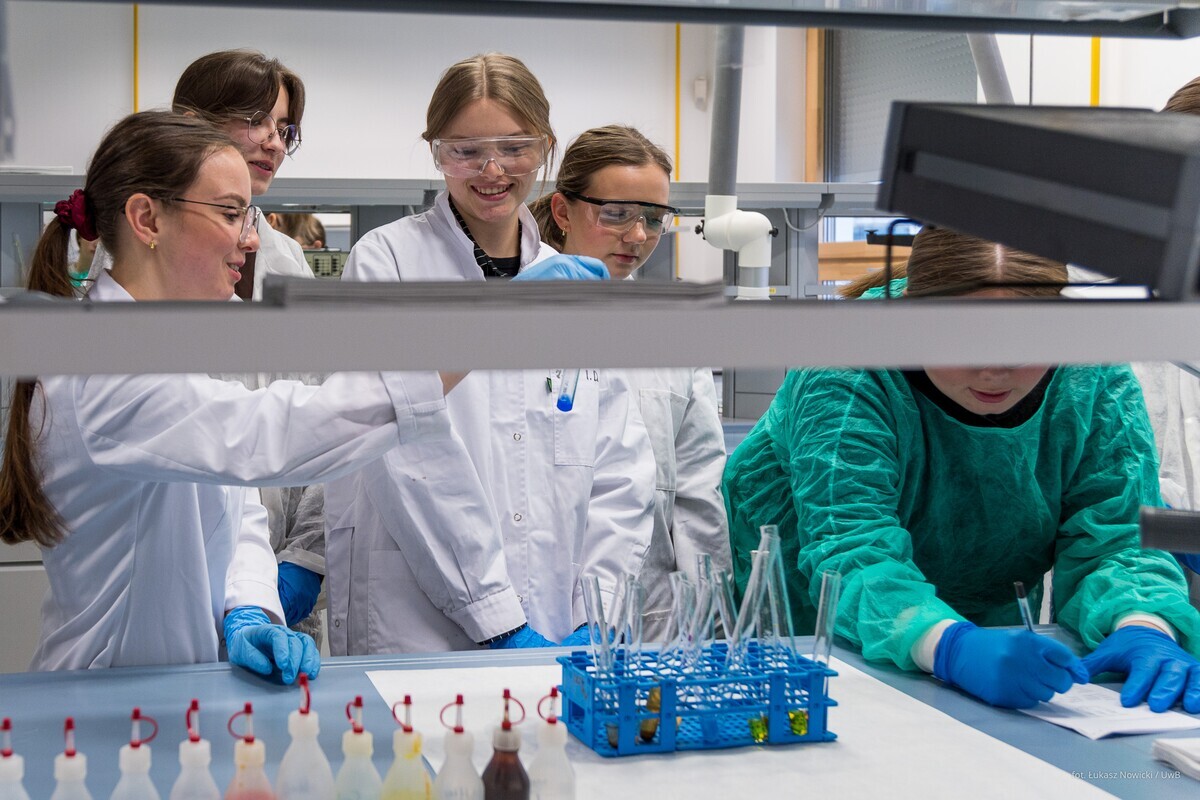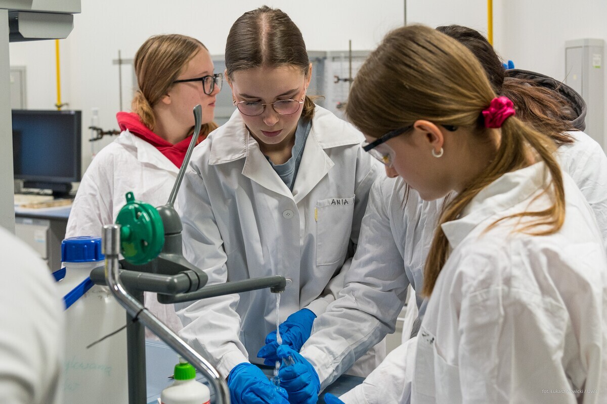 W ramach akcji Studiuj z UwB, 8 stycznia 2026 roku, kampus Uniwersytetu w Białymstoku odwiedzili uczniowie z I Liceum Ogólnokształcącego im. M. Skłodowskiej-Curie w Sokołowie Podlaskim. Młodzież uczestniczyła w wykładzie dr. Marka Bartoszewicza „Tajemnice ludzkiego mózgu” z Wydziału Biologii oraz w zajęciach dr Justyny Makowskiej „Informacja i strategia: od Monty Halla do bisekcji” z Wydziału Matematyki. Uczniowie klas biologiczno-chemicznych natomiast z dużym zainteresowaniem wzięli udział w warsztatach laboratoryjnych prowadzonych przez dr hab. Izabelę Dobrzyńską, prof. UwB, oraz dr Annę Sankiewicz z Wydziału Chemii. Wszystkie zaplanowane eksperymenty młodzież wykonała własnoręcznie śledząc właściwości związków pierwiastków bloku d: chromu(III), manganu(II), miedzi(II). Po zajęciach uczniowie wzięli udział w seansach edukacyjnych w Planetarium UwB oraz udali się na spacer po kampusie w celu poznania nowoczesnej infrastruktury naukowej.