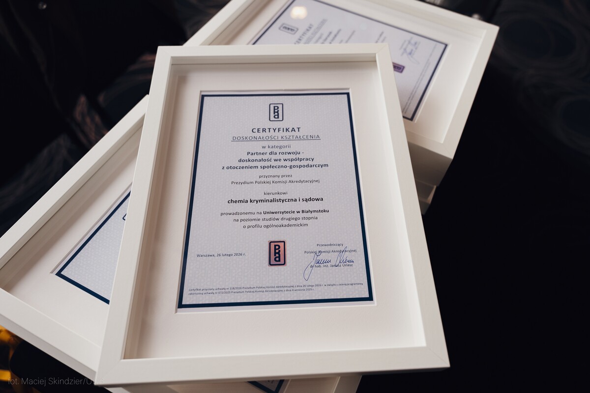 To wielki sukces Wydziału Chemii i całej uczelni. Kierunek chemia kryminalistyczna i sądowa otrzymał Certyfikat Doskonałości Kształcenia w kategorii Partner dla rozwoju − doskonałość we współpracy z otoczeniem społeczno-gospodarczym. Wyróżnienie przyznała Polska Komisja Akredytacyjna. To drugi taki certyfikat – po kierunku prawo - dla Uniwersytetu w Białymstoku.