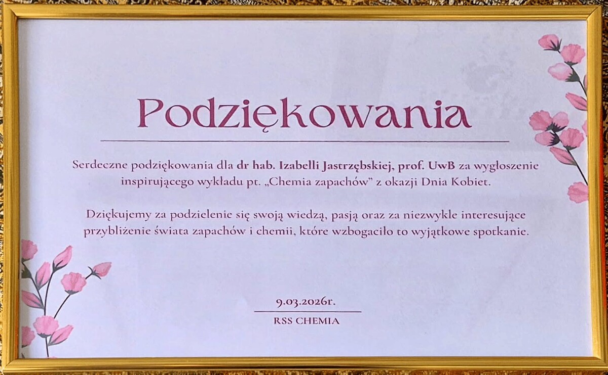 9 marca na Wydziale Chemii Uniwersytetu w Białymstoku odbył się wykład dr hab. Izabelli Jastrzębskiej, prof. UwB pt. „Chemia zapachów”. Wydarzenie zostało zorganizowane z okazji Dnia Kobiet oraz Dnia Mężczyzn na wniosek studentów z Rady Samorządu Studentów Wydziału Chemii.