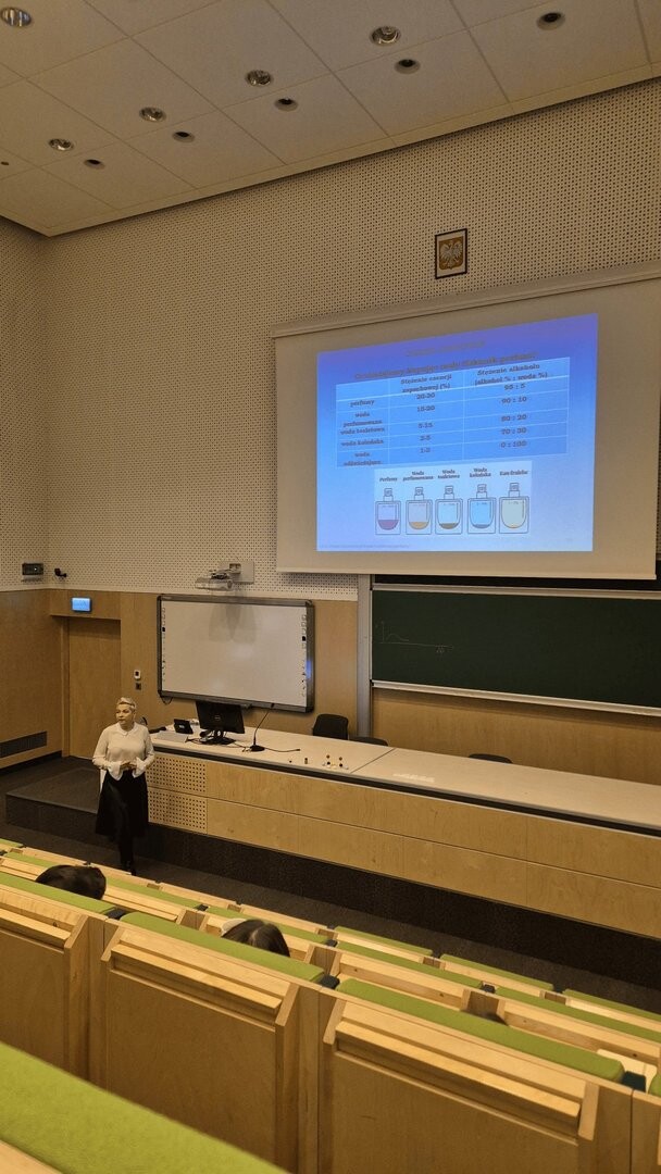 Podczas wykładu uczestnicy mieli okazję poznać chemiczne podstawy powstawania zapachów, dowiedzieć się, jakie związki chemiczne odpowiadają za aromaty oraz jak tworzone są kompozycje zapachowe stosowane w perfumerii.