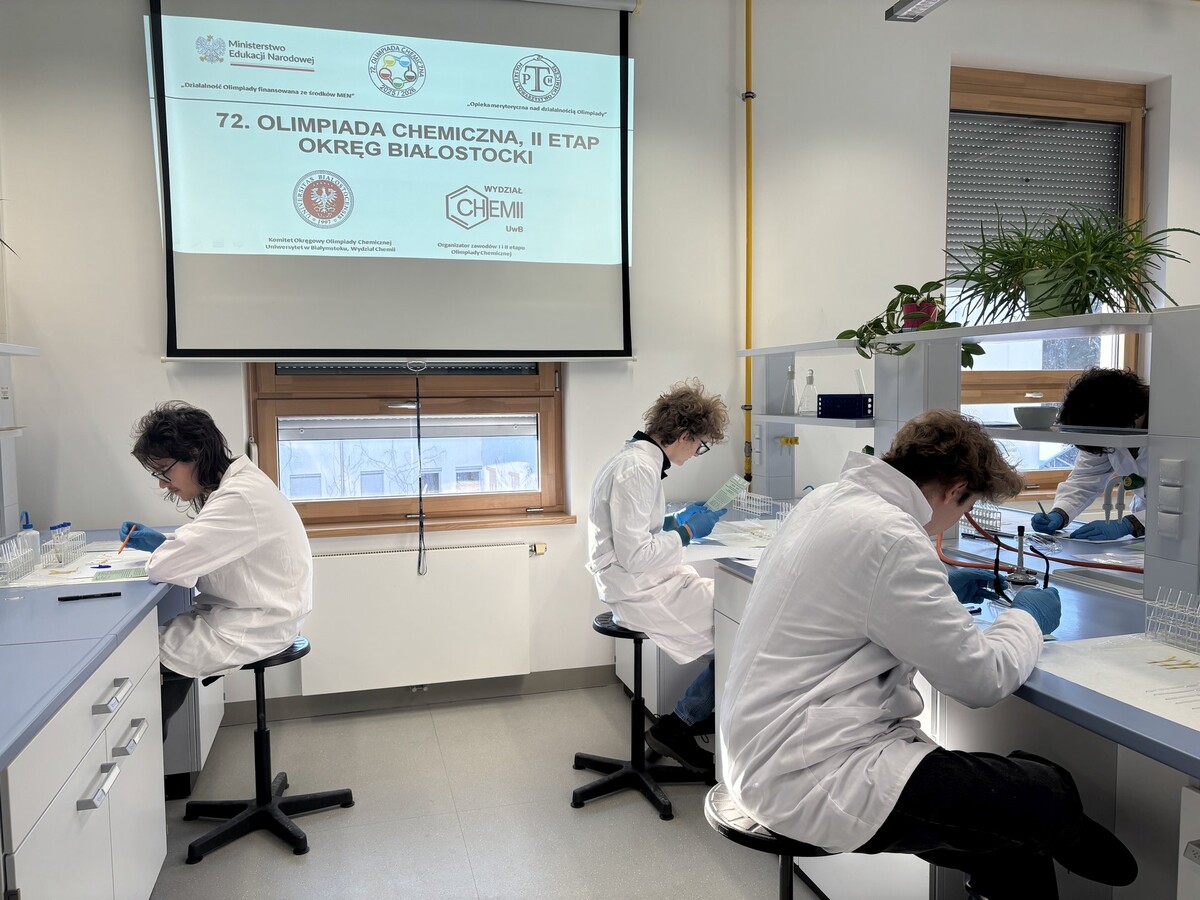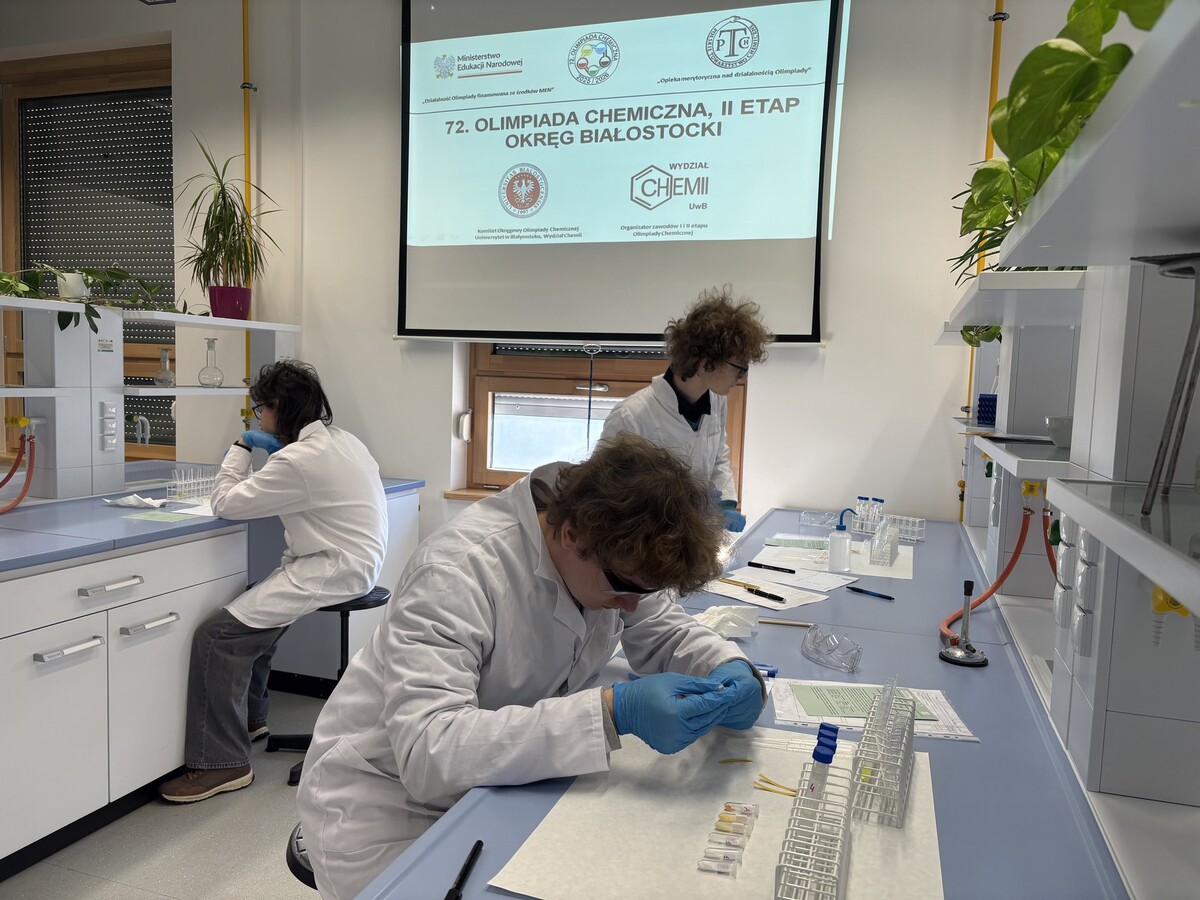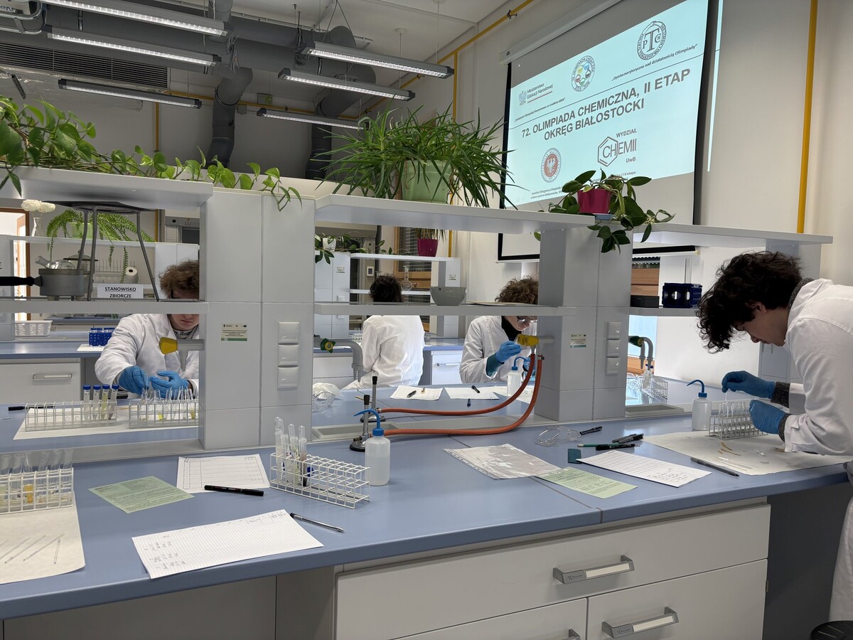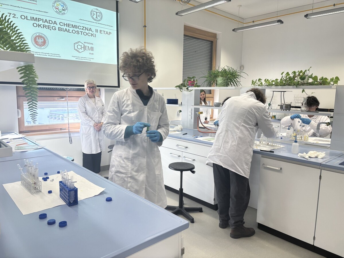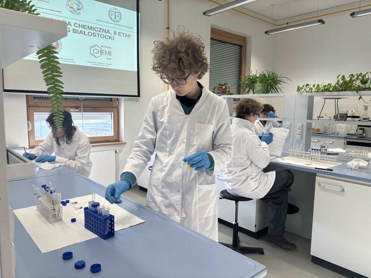 W sobotę zawodnicy przez cztery godziny rozwiązywali zadanie laboratoryjne pt. Analiza materiałów trudno rozpuszczalnych (pigmenty naturalne i syntetyczne). Wyniki II etapu Olimpiady Chemicznej zostaną opublikowane 11.02.2026 r. Uczestnikom Olimpiady z okręgu białostockiego życzymy kwalifikacji do III etapu.