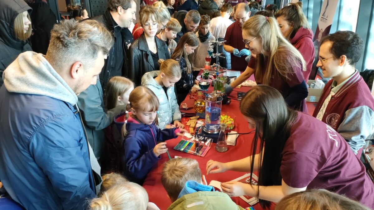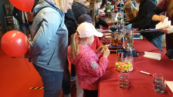 W niedzielę, 18 maja, nasze stoisko chemiczne przyciągało dużych i małych fanów nauki. Były tęczowe reakcje, kolorowe wiry, magiczna niebieska butelka, a także możliwość wykonania własnych odcisków palców i sprawdzenia dokumentów pod światłem UV.
