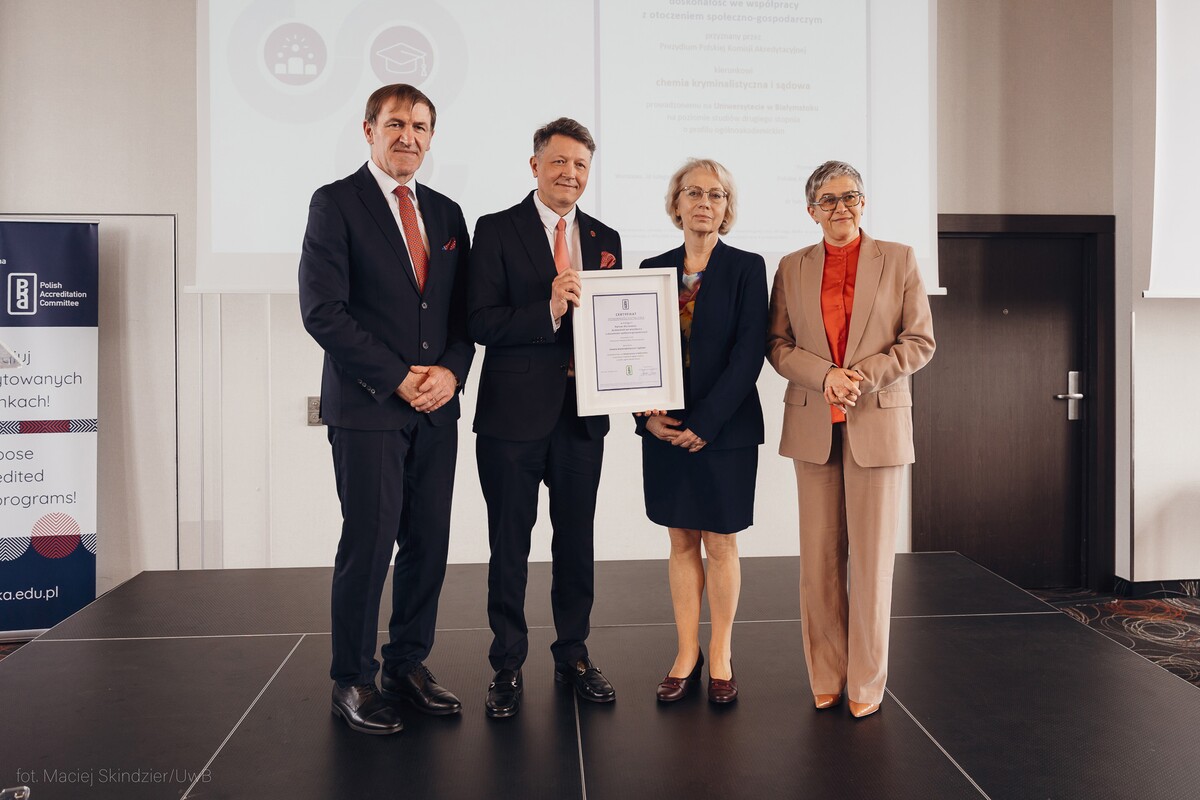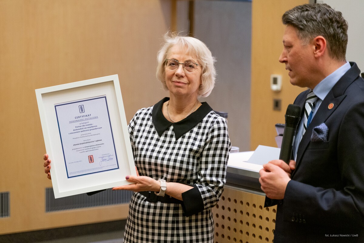 Kierunek chemia kryminalistyczna i sądowa realizowany jest na studiach stacjonarnych II stopnia na Wydziale Chemii UwB. Certyfikat Doskonałości Kształcenia Polskiej Komisji Akredytacyjnej został przyznany w kategorii Partner dla rozwoju − doskonałość we współpracy z otoczeniem społeczno-gospodarczym.