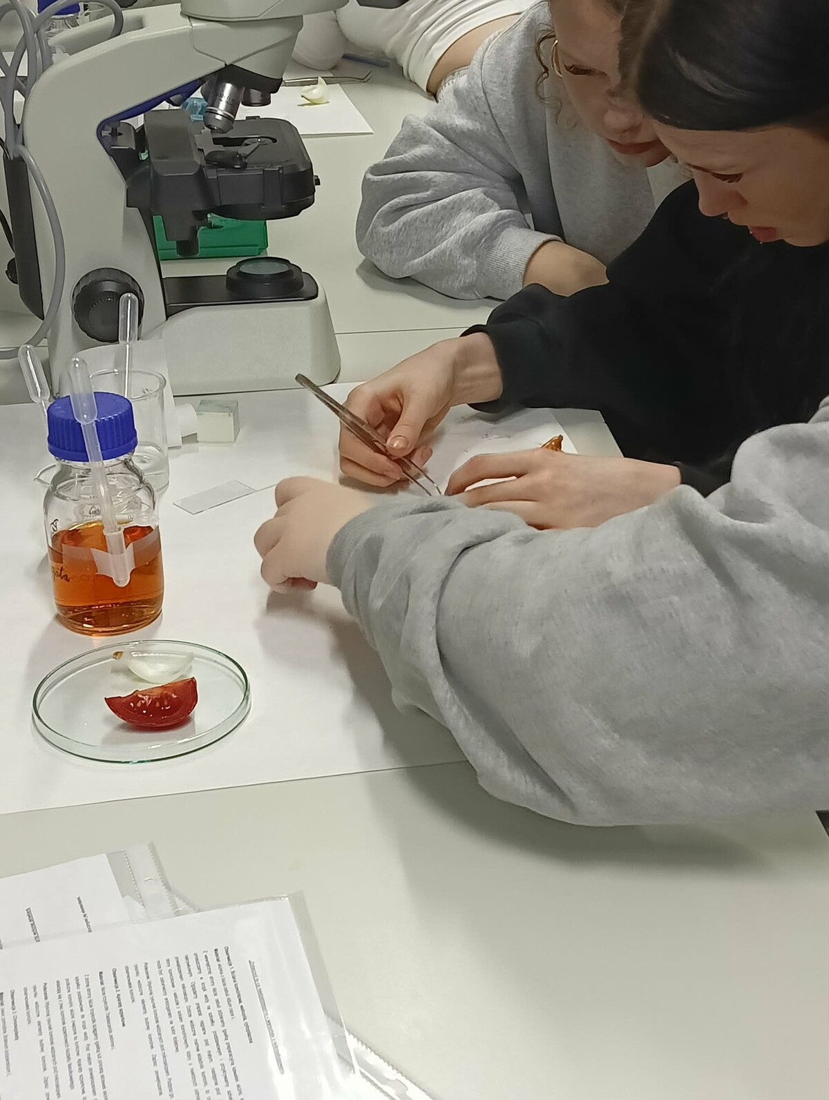 Warsztaty na Wydziale Biologii były doskonałą okazją do przećwiczenia wiedzy zdobytej w szkole w praktyce. Uczestnicy zapoznali się z zasadami wykonywania preparatów nietrwałych i wykorzystania mikroskopu świetlnego do ich obserwacji. Podczas spotkania uczestnicy obserwowali proces plazmolizy w komórkach skórki liścia cebuli, rozmieszczenie aparatów szparkowych w skórce liścia trzykrotki, chromoplasty w miąższu pomidora, ziarna skrobi w miąższu bulwy ziemniaka i końcowe produkty przemiany materii w postaci kryształów szczawianu wapnia w suchych łuskach cebuli.