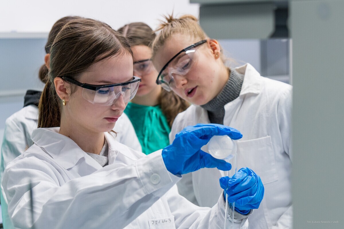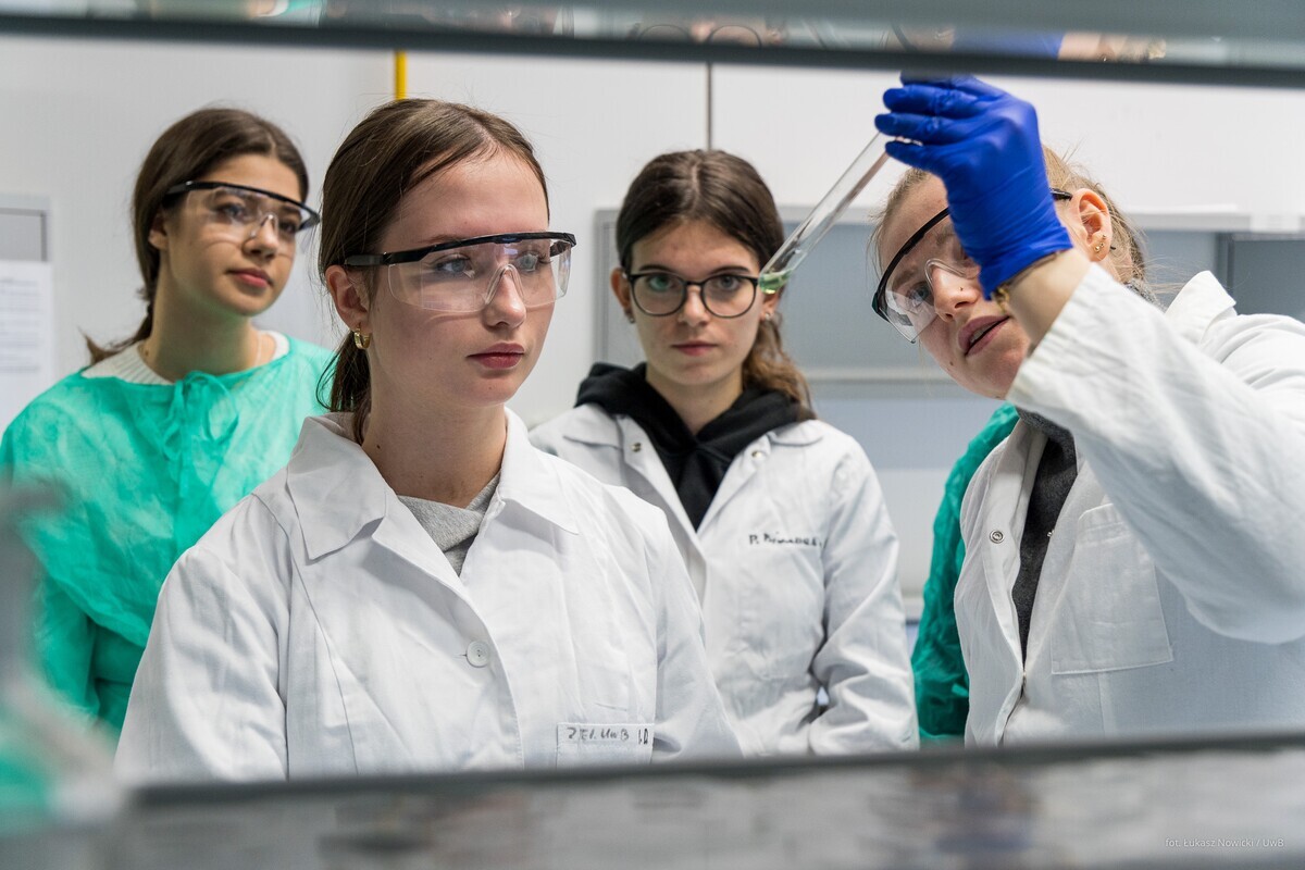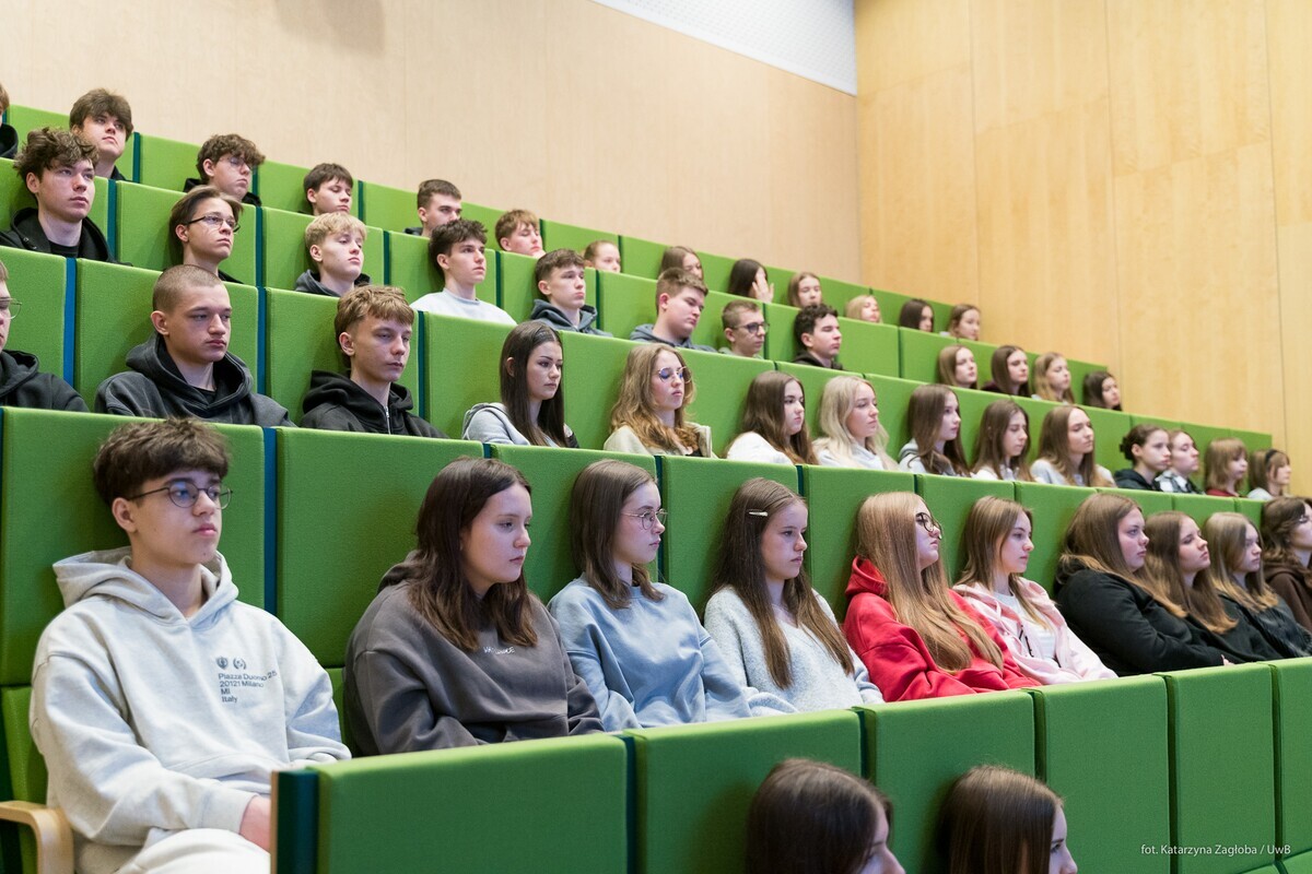 W ramach akcji Studiuj z UwB, 8 stycznia 2026 roku, kampus Uniwersytetu w Białymstoku odwiedzili uczniowie z I Liceum Ogólnokształcącego im. M. Skłodowskiej-Curie w Sokołowie Podlaskim. Młodzież uczestniczyła w wykładzie dr. Marka Bartoszewicza „Tajemnice ludzkiego mózgu” z Wydziału Biologii oraz w zajęciach dr Justyny Makowskiej „Informacja i strategia: od Monty Halla do bisekcji” z Wydziału Matematyki. Uczniowie klas biologiczno-chemicznych natomiast z dużym zainteresowaniem wzięli udział w warsztatach laboratoryjnych prowadzonych przez dr hab. Izabelę Dobrzyńską, prof. UwB, oraz dr Annę Sankiewicz z Wydziału Chemii. Wszystkie zaplanowane eksperymenty młodzież wykonała własnoręcznie śledząc właściwości związków pierwiastków bloku d: chromu(III), manganu(II), miedzi(II). Po zajęciach uczniowie wzięli udział w seansach edukacyjnych w Planetarium UwB oraz udali się na spacer po kampusie w celu poznania nowoczesnej infrastruktury naukowej.