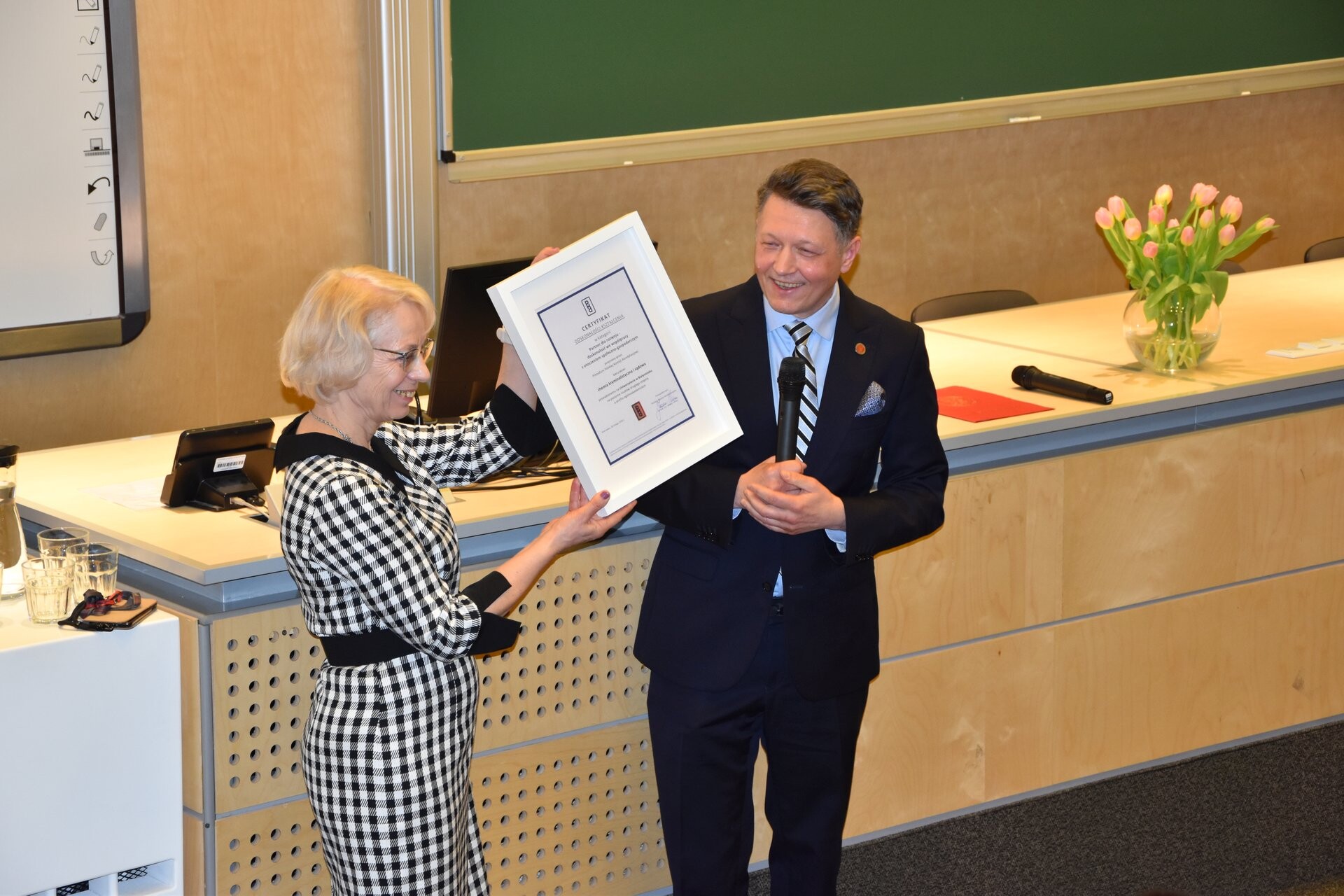 - Panie Rektorze serdecznie dziękuję za bardzo miłe słowa. Myślę, że każdy z nas wziął je sobie do serca. Obiecujemy, że będziemy nadal starać się tak samo jak do tej pory, a może nawet bardziej. Chcemy, by ten certyfikat nie był tylko incydentalnym sukcesem, ale żeby wpisał się w naszą historię – mówiła dziekan Wydziału Chemii prof. Joanna Karpińska.